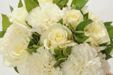 Our rose and carnation cross features a swag of one dozen roses decorating a cross covered with carnations and accented with assorted greenery presented on an easel.