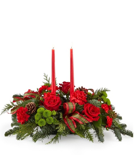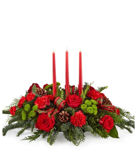 A beautiful and traditional holiday centerpiece made of red roses, miniature carnations, chrysanthemums and fresh evergreens arranged into a beautiful centerpiece accented with ribbons and pinecones. Available in 3 sizes with 1, 2 or 3 candles.