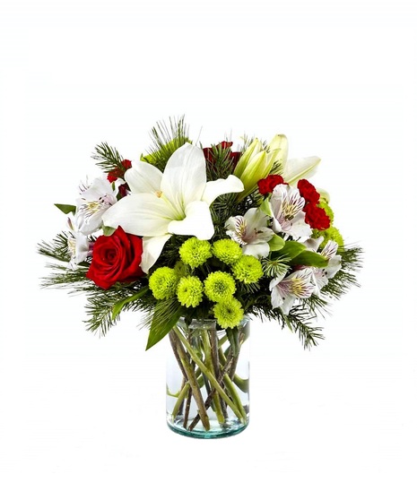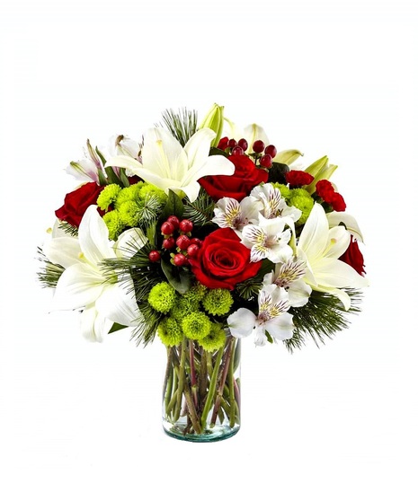 A beautiful seasonal bouquet of assorted evergreens, red roses, white lilies, alstroemeria, berries and more arranged in a clear glass vase.