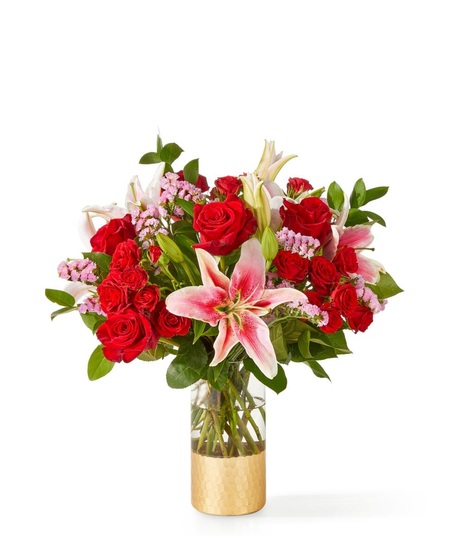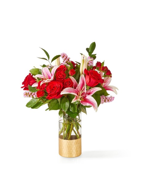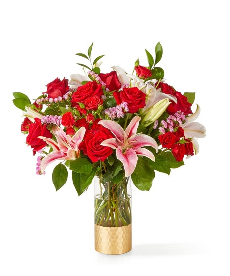 Fragrant Stargazer Lilies, standard and miniature red roses, accent flowers and greenery arrive in a clear cylinder vase featuring a gold honeycomb hammered band around the base. It makes a uniquely elegant way to express what's in your heart, this Valentine's Day.
