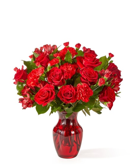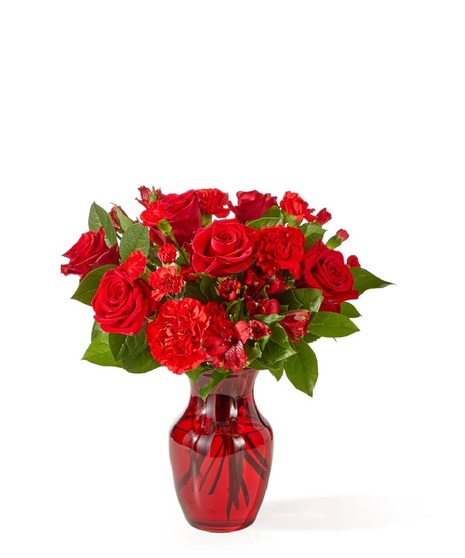 Give her this lovely bouquet of red flowers including red roses, carnations, miniature carnations, alstroemeria and greenery presented in a red glass vase. She will know she has the "Key to your heart".