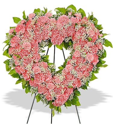 Our traditional carnation heart features 60 carnations, assorted greenery and million star baby's breath presented on a 60" wire easel.